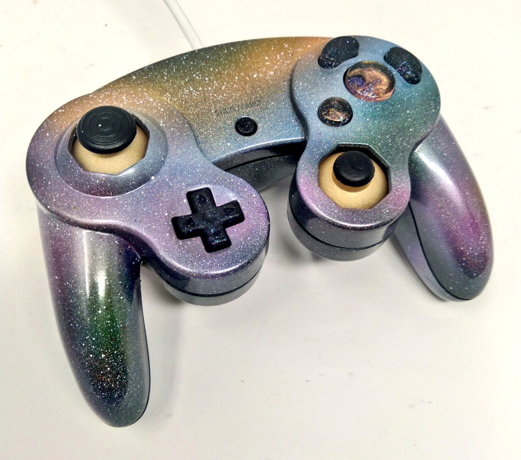 Painted Gamecube Controllers are made by wet sanding a original shell then priming it for the base coat applying any color shift/decals logos etc followed up by a 2k clear coat for a high polish mirror finish. Painted Gamecube Controllers are best for full on art customizations were almost anything is possible!